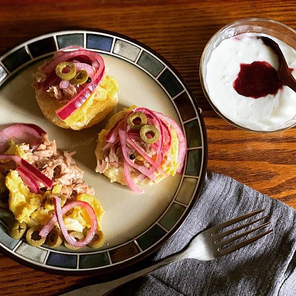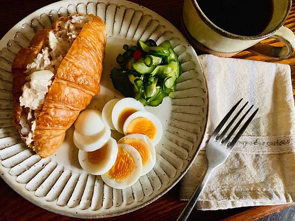 窗外下著雨,這樣的氛圍,沈靜又美好,完美的早餐。❤️鮪魚洋蔥沙拉可頌。❤️紫蘇梅汁拌黃瓜。❤️營養滿分水煮蛋。❤️單品黑咖啡。